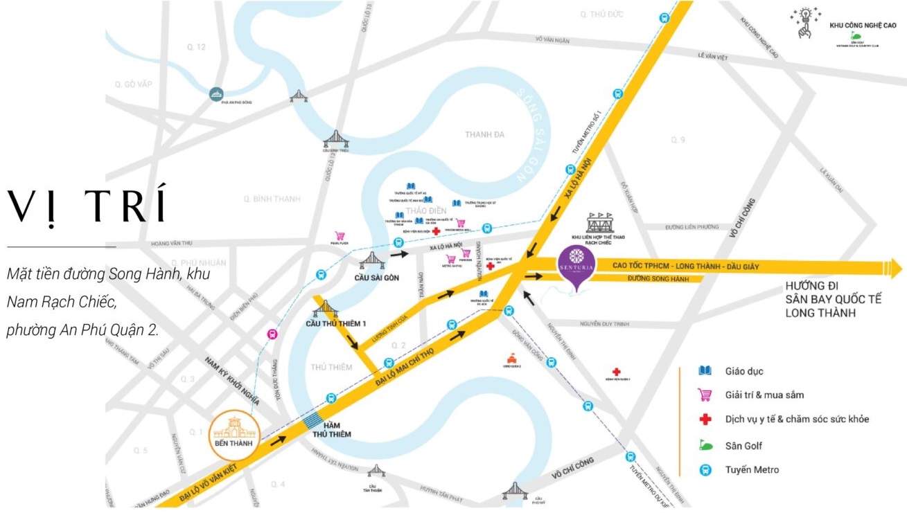 Vị trí địa chỉ dự án Senturia An Phú tọa lạc tại trung tâm của Quận 2, giáp sông Giồng Ông Tố và Mương Kinh. Vị trí dự án được cho là khá thuận tiện, tiếp cận dễ dàng đến với các tiện ích lân cận. Giá trị của một bất động sản không chỉ nằm ở bản thân nó, mà còn được quyết định bởi hệ sinh thái và hạ tầng xung quanh. Senturia An Phú đang tọa lạc tại tâm điểm của một cuộc cách mạng hạ tầng giao thông chưa từng có, biến mỗi mét vuông đất tại đây trở nên đắt giá theo thời gian.